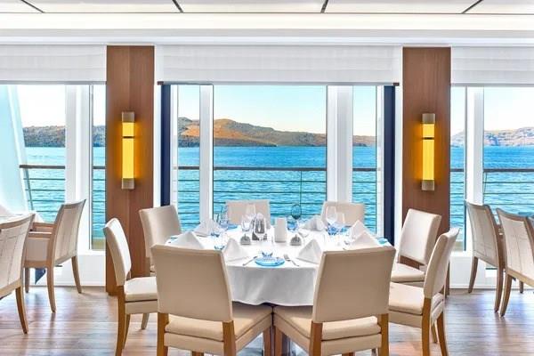 Our main dining venue, The Restaurant, offers the highest onboard dining experience. Regional cuisine and always available classics are served surrounded by sweeping exterior views through all-glass walls.